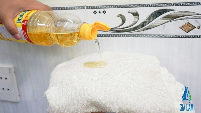 Sau đó, lấy một ít bông hoặc dẻ thấm dầu ăn rồi lau lên vết băng dính và đợi khoảng 5 phút.